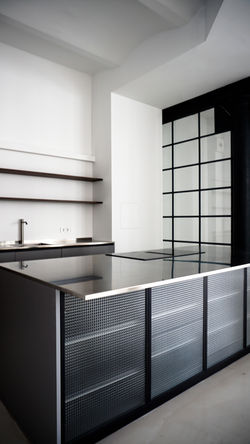 ein projekt im stile von industrial design durfte ich hier mitgestalten. sehr reduziert, die bauart (stahlträger) in den fokus gerückt, boden mit einer betonoberfläche gehalten, welcher schon bald eine schöne patina annehmen wird. stauraum gleich mit in die rigips-wände verbunden um alles bündig und zurückhaltend zu gestalten.